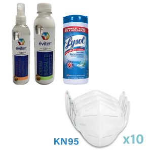Incluye crema antiséptica, sanitizante de superficies, toallitas desinfectantes y 10 pz de cubrebocas KN95.